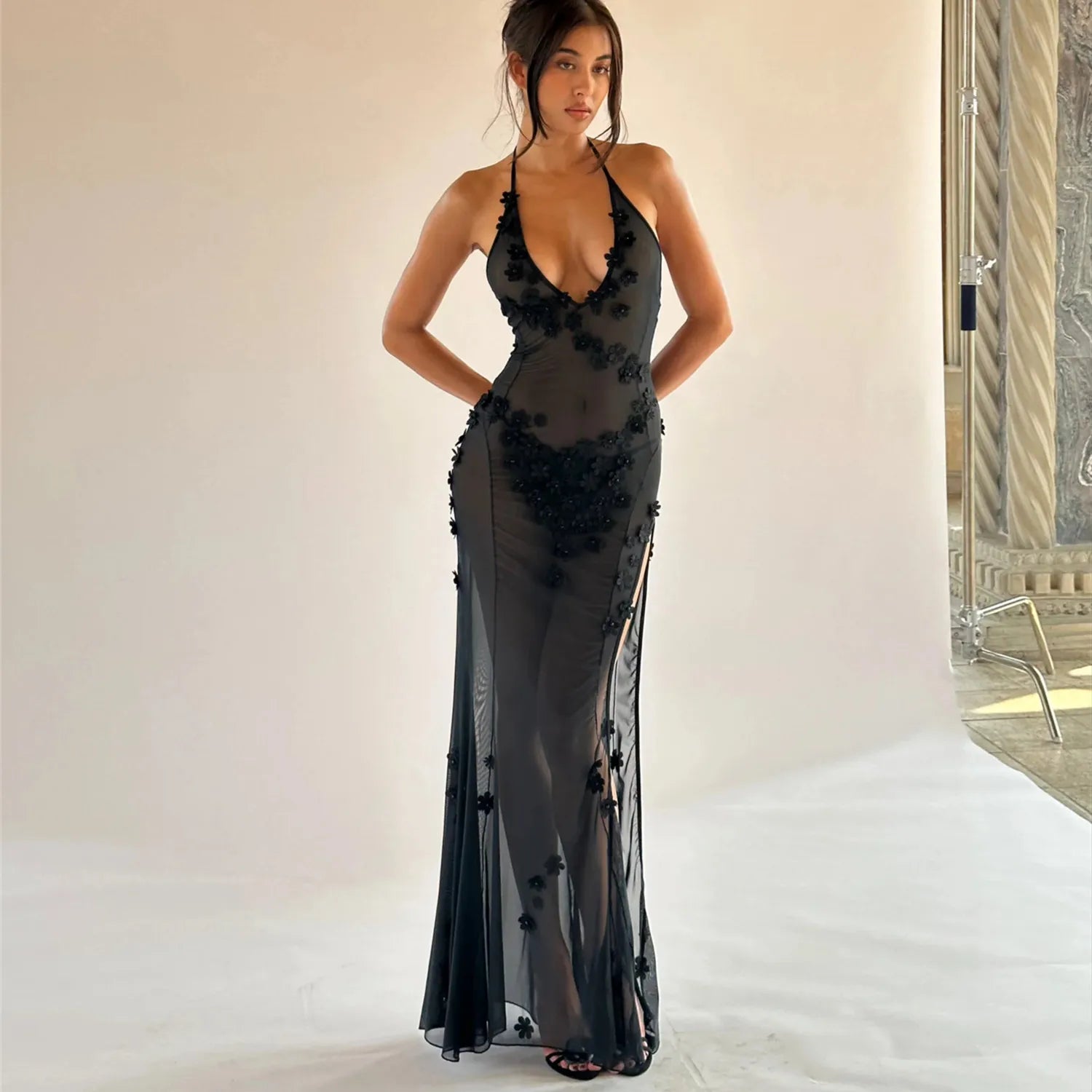 Step into elegance with the Delilah Maxi Dress, where dreamy design meets unmatched craftsmanship. Crafted from premium sheer stretch mesh, it features hand-stitched floral appliques and a cupped bust that sculpts and supports. A thigh-high slit adds graceful movement to this unforgettable silhouette.