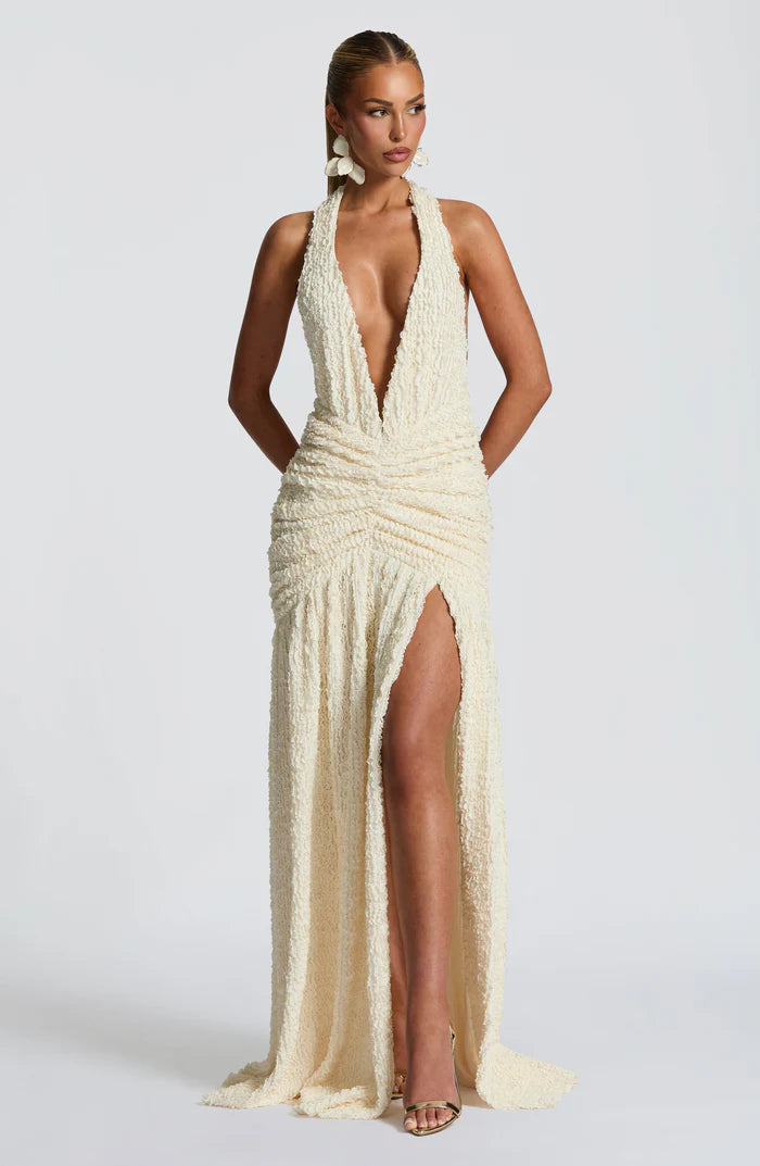 The Minerva Maxi Dress features a textured cut-and-sew fabric with a deep plunging neckline and elegant halterneck straps tied at the back. Its low V-shaped back and ruched hips enhance the silhouette, while the thigh-high split and full gathered skirt add graceful movement.
