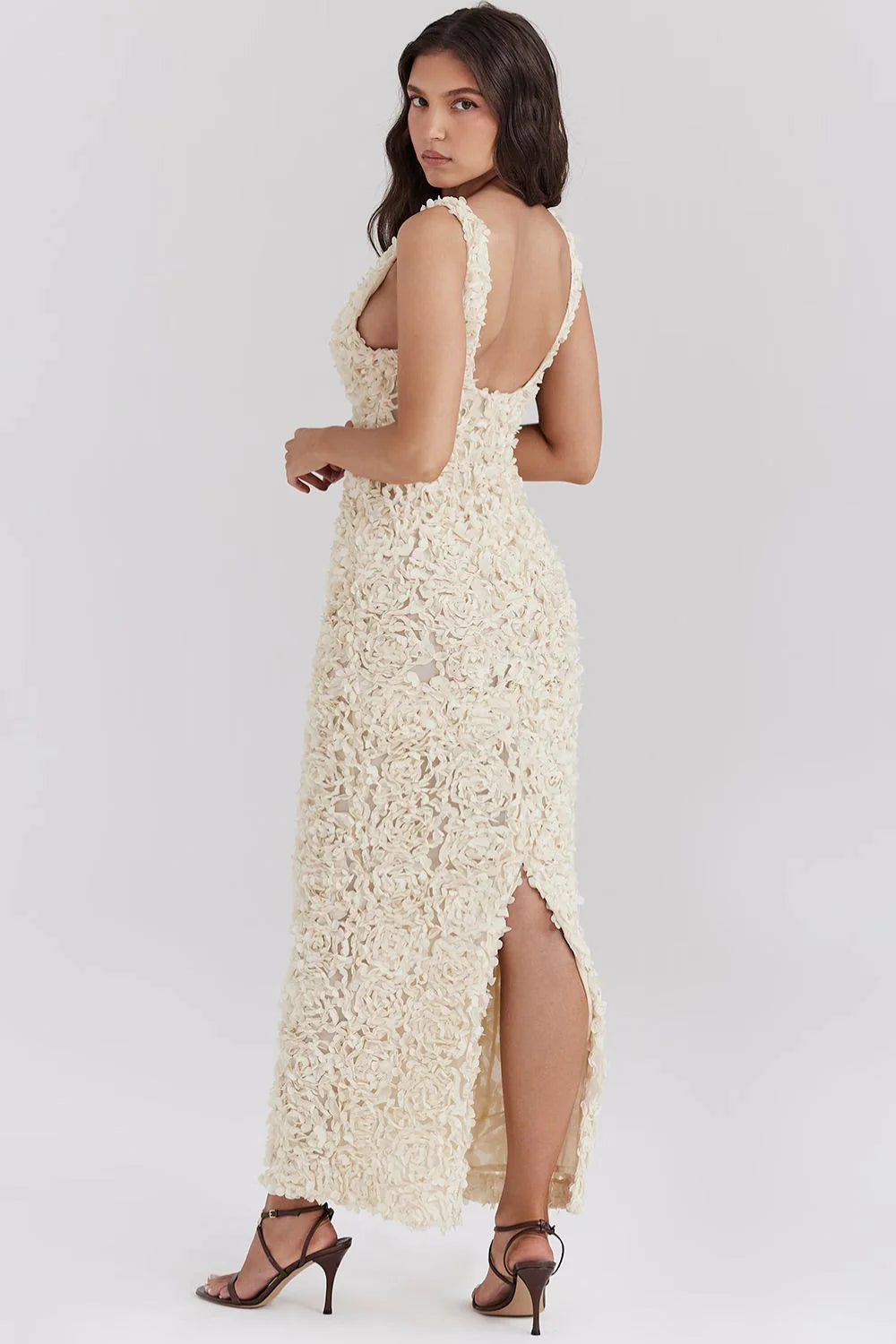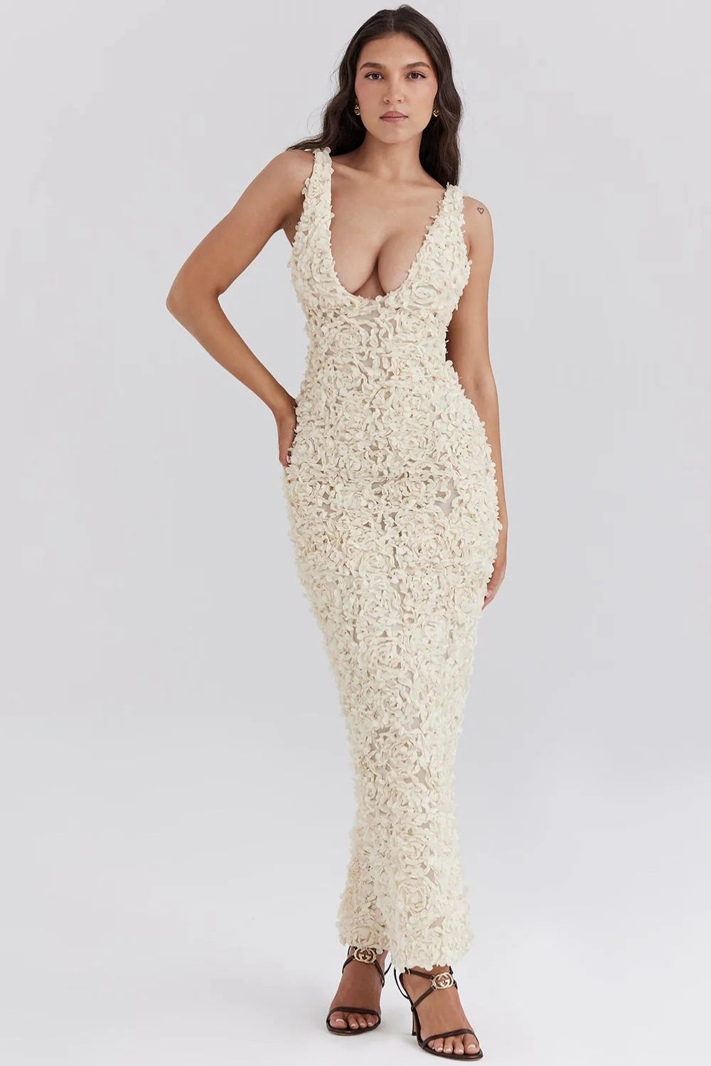 The Robyn Maxi Dress is exceptional, designed for glamorous events. Adorned with delicate 3D appliqué roses, it features a daring plunge neckline and back, with a smooth fit thanks to stretch power mesh lining. The elegant pencil silhouette falls to a maxi length with a generous back split for ease of movement.