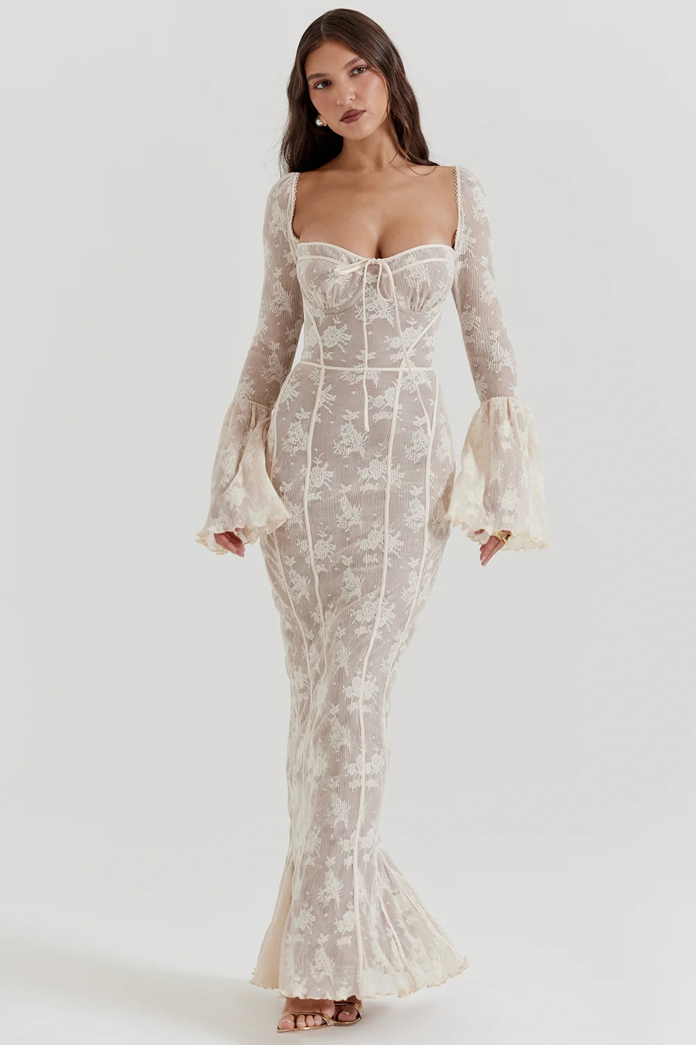 Introducing the Serena Maxi Dress, a timeless classic crafted from delicate dotted lace with luxurious satin trims. Underpinned by figure-hugging café au lait power mesh, it features underwired cups, a sweetheart neckline, and internal boning for a flattering silhouette.