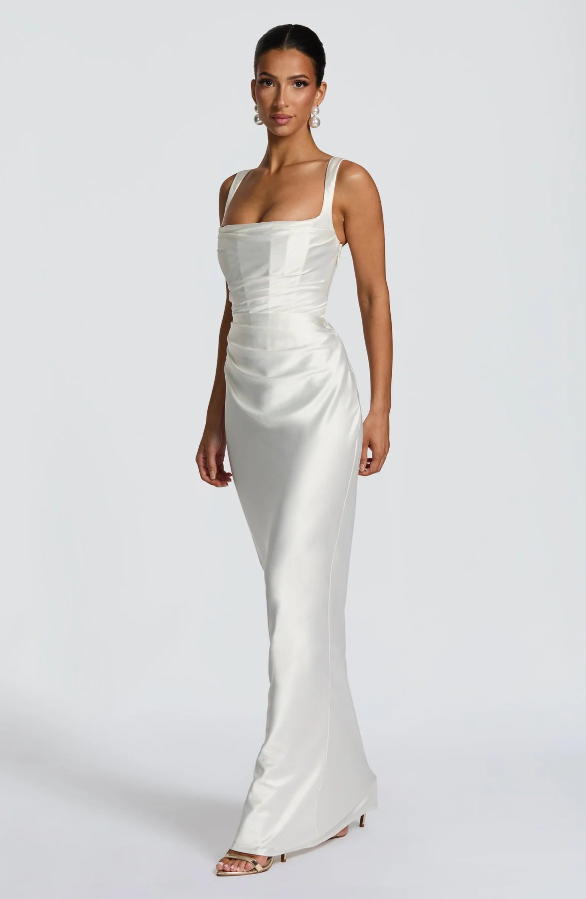 The Calanthe Maxi Dress features a luxurious non-stretch satin fabric, a refined square neckline with elegant pleated draping, and asymmetric pleats on the bodice. Tapered straps and a lace-up back add a delicate, sophisticated touch to this graceful silhouette.