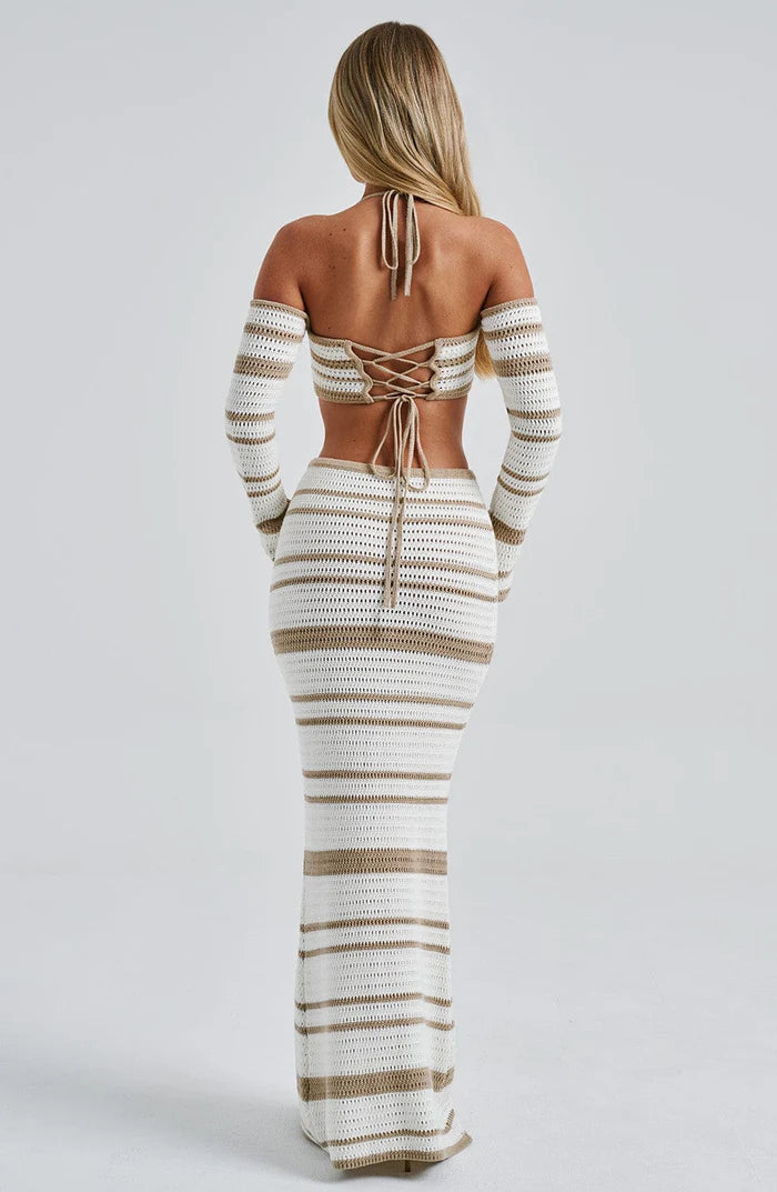 Georgia was made for the sun chasers. A premium crochet knit design with a chic stripe pattern, this iconic piece is off the shoulder, with long flare sleeves and a sweetheart neckline. A halterneck strap can be tied around the neck, while the back is laced up for your perfect fit. Looks amazing worn with the matching Georgia knit skirt, heeled sandals and glowing makeup.