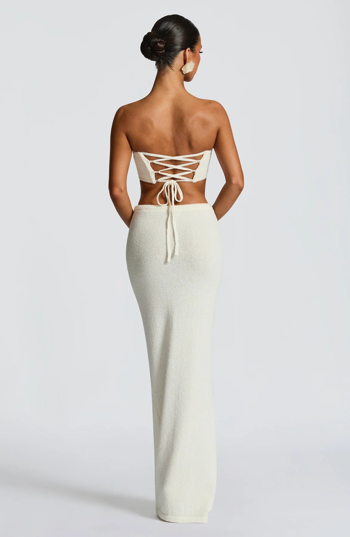 The Sola Maxi Set features a soft knitted yarn with a flattering mid-rise and body-hugging fit. Its maxi length and elegant knitted flower detail at the waist add a refined, sophisticated touch to your wardrobe.