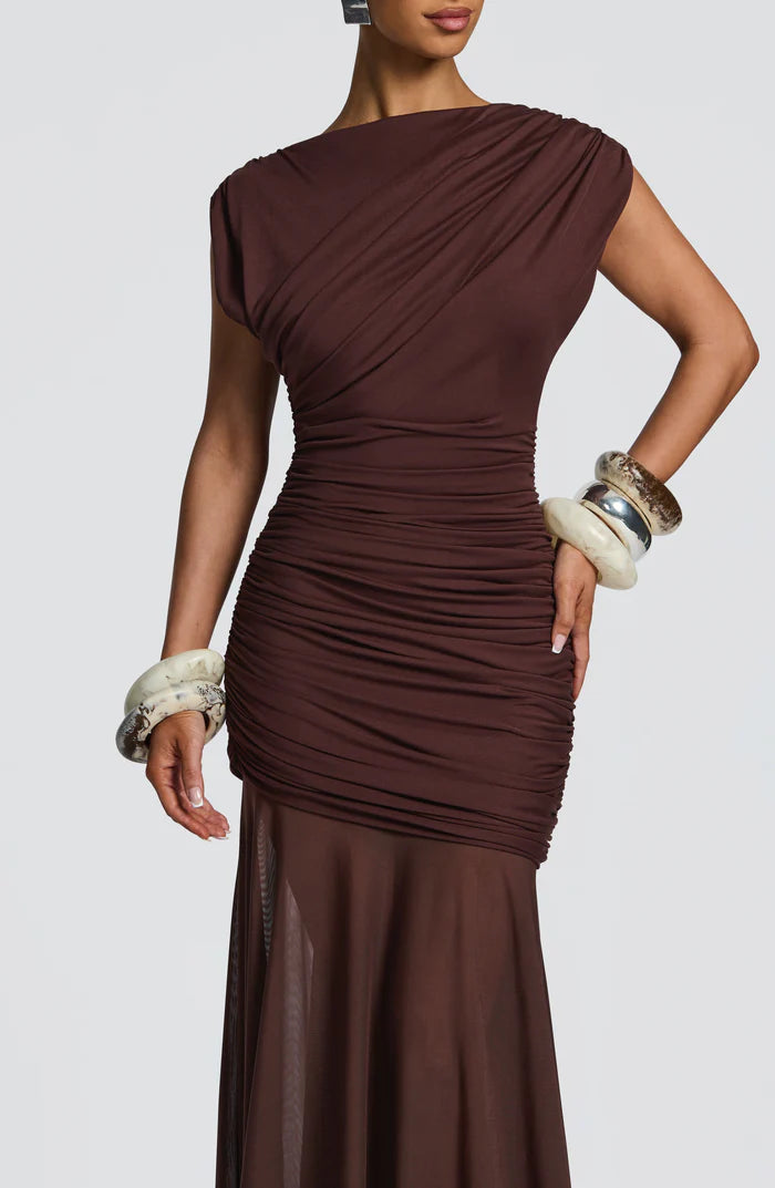 Elegant and effortlessly chic, the Demelza Maxi Dress features a soft modal jersey bodice with a high boat neckline, cross-body pleats on the bust, and flattering ruching through the torso. With drop shoulders, an asymmetric hem, and a fitted waist flowing into a full, flared mesh skirt.