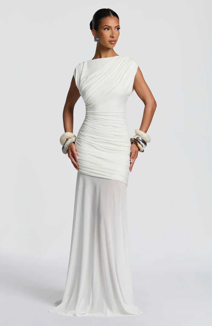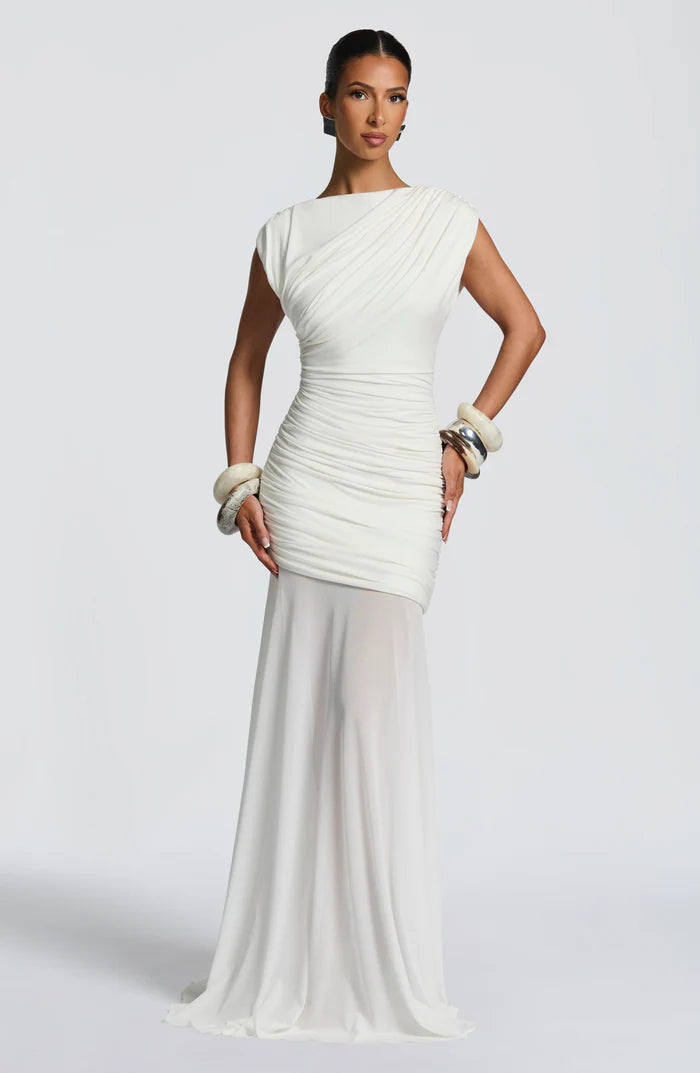 Elegant and effortlessly chic, the Demelza Maxi Dress features a soft modal jersey bodice with a high boat neckline, cross-body pleats on the bust, and flattering ruching through the torso. With drop shoulders, an asymmetric hem, and a fitted waist flowing into a full, flared mesh skirt.