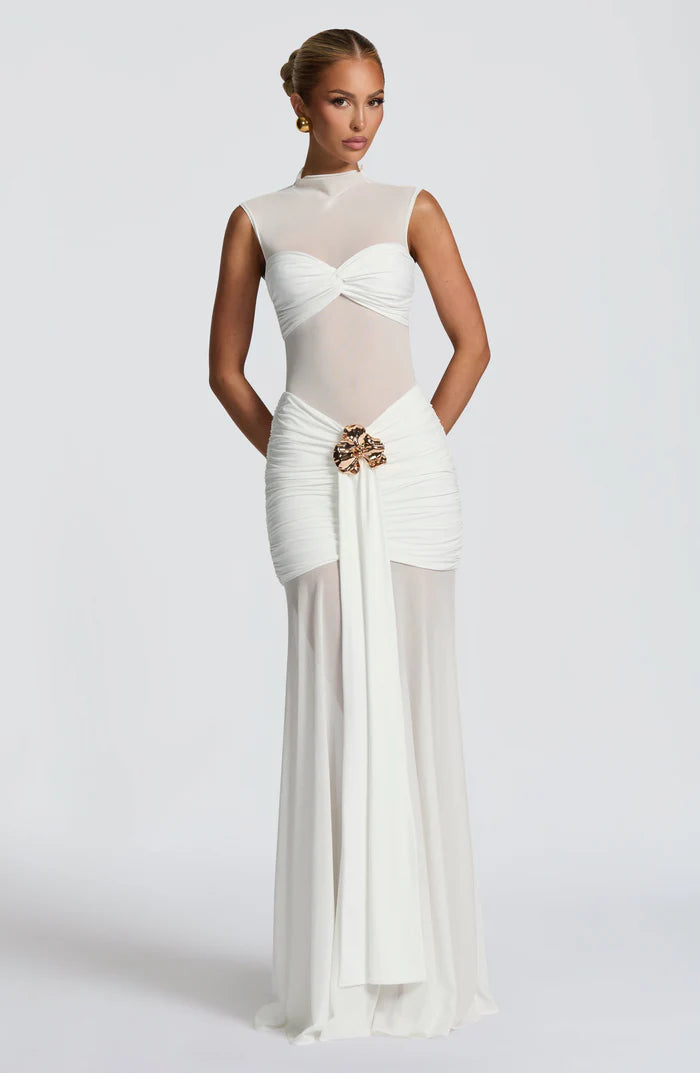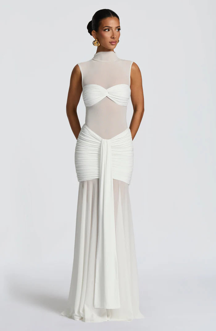 The Fae Maxi Dress features a longline sheer mesh bodice with a high mock neck and sleeveless design. A slinky twist bandeau overlay accents the bust for a refined, elegant look.