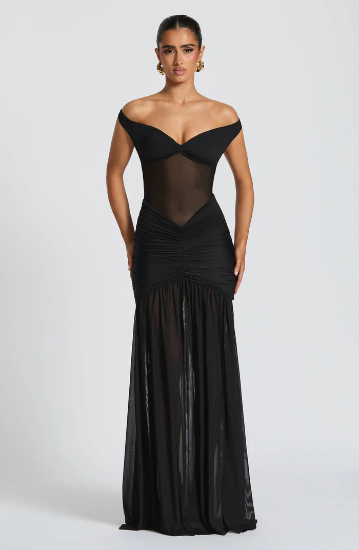 Elevate your evening attire with the Alaia Maxi Dress in striking colours. This sophisticated design features a sheer mesh bodice with an elegant bardot neckline and elasticated back strap for comfort. The slinky fabric cascades from a dropped waist with tightly ruched hip panels into a full skirt with a daring thigh-high split.