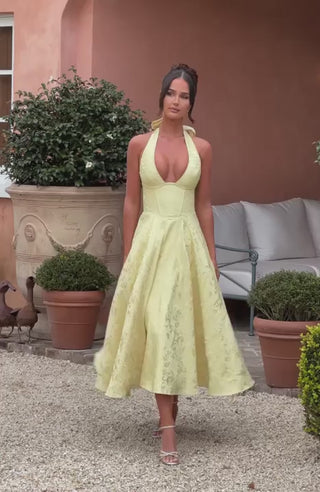 A showstopping dress that exudes romantic, timeless elegance - meet Effie. Offering a sophisticated silhouette, it features a full midi skirt made with tulle for added volume, and a super cinched bodice with boning to snatch the waist. With a plunge halter neckline and lace up back for your perfect fit, it's crafted in our luxe floral jacquard which feels super feminine and classic.