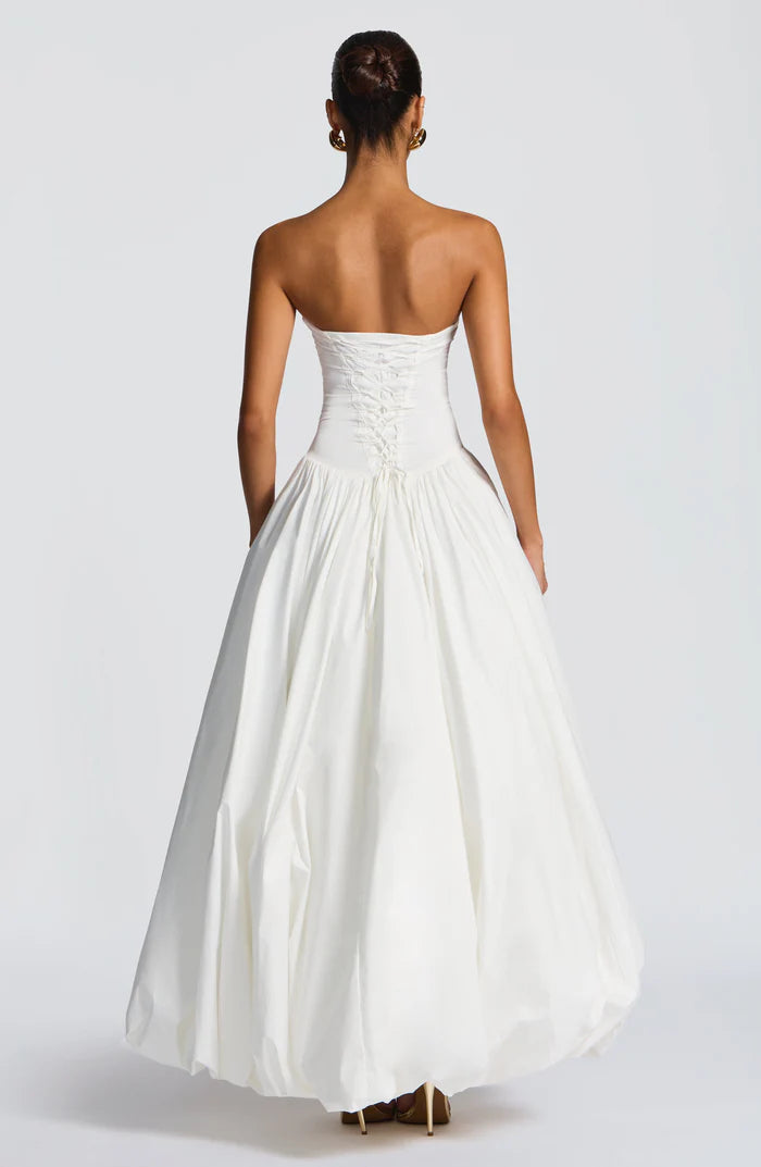 The Jillian Maxi Dress features a strapless neckline and a ruched bodice with a lace-up back for a tailored fit. Its dropped waist flows into a dramatic puff ball skirt with a thigh-high split, combining elegance with bold style.