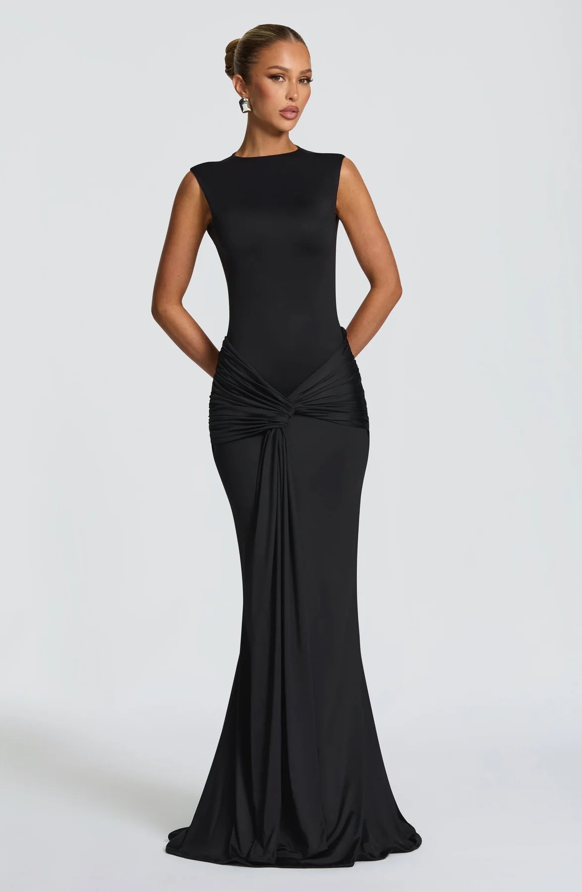 The Lorenza Maxi Dress combines a sleek high neckline with an open keyhole back. Made from slinky jersey, it features a fitted bodice and fit-and-flare skirt, highlighted by a ruched knot detail and drape tie for a refined silhouette.