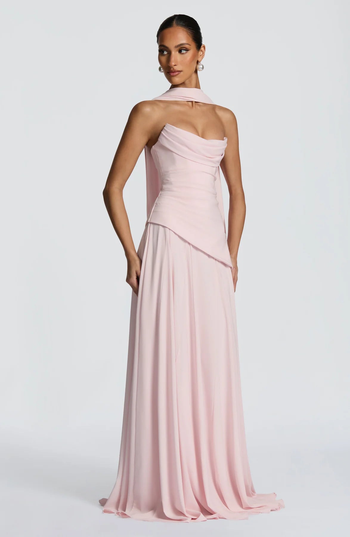 The Patricia Maxi Dress features a delicate chiffon fabric with a scooped neckline and pleated cowl. Its structured bodice includes an asymmetric hem and refined pleating at the waist, flowing into a full skirt with elegant godets. Finished with a lace-up back for a perfect fit.