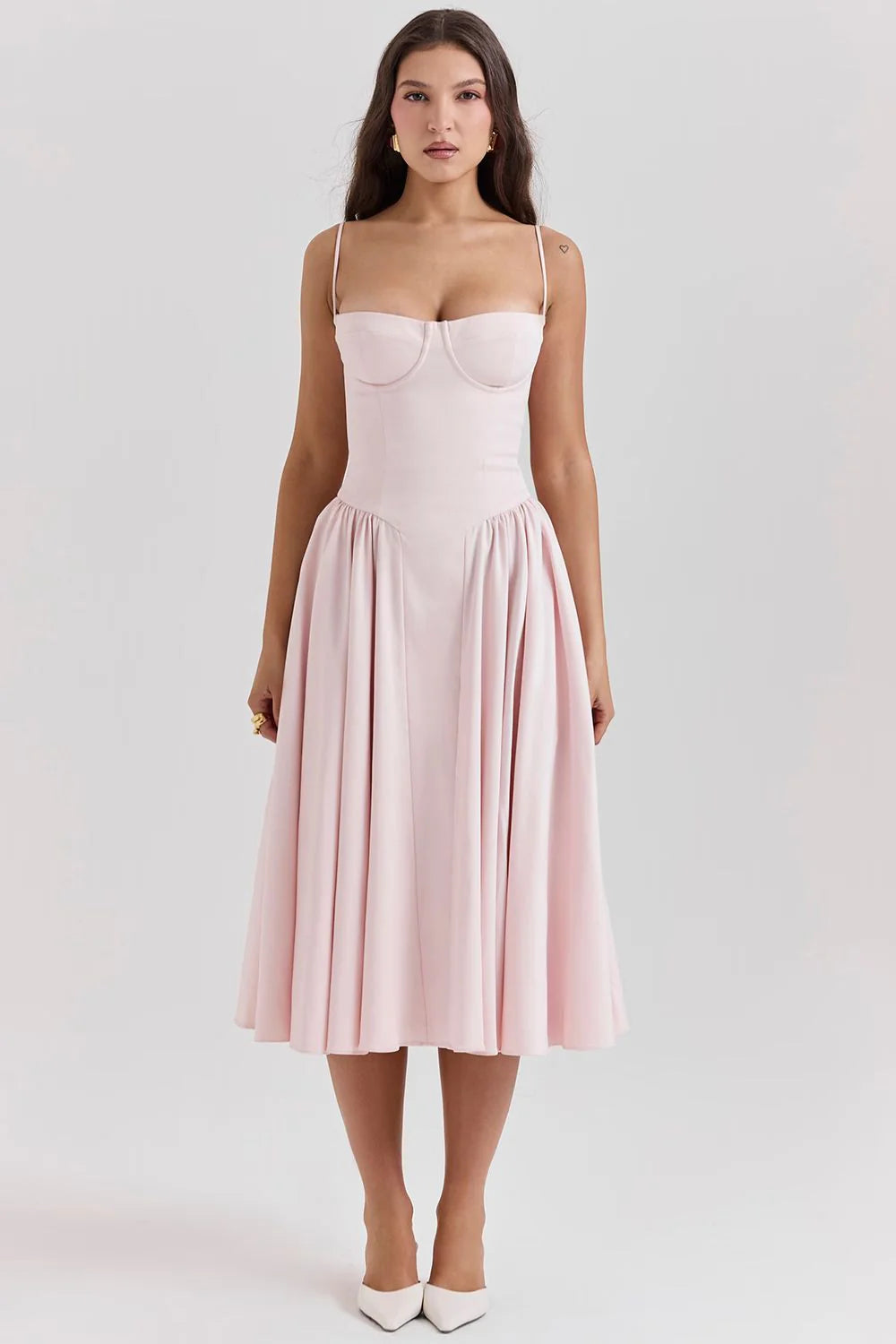 Penelope is your perfect all-season dress. Crafted from breathable twill fabric, it features boning through the bodice to cinch the waist and a sweetheart neckline with underwired cups. Barely-there adjustable straps and gathered detailing add feminine volume to the midi skirt.