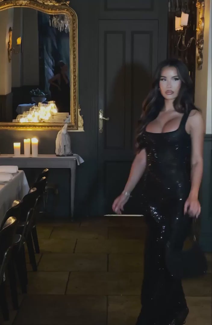 Be the star you are in the Petra dress, a shimmering, sparkling maxi cut from soft stretch net embellished with all-over rhinestones. With a sexy, semi sheer appearance, the dress is complete with a square neckline and low scoop back.