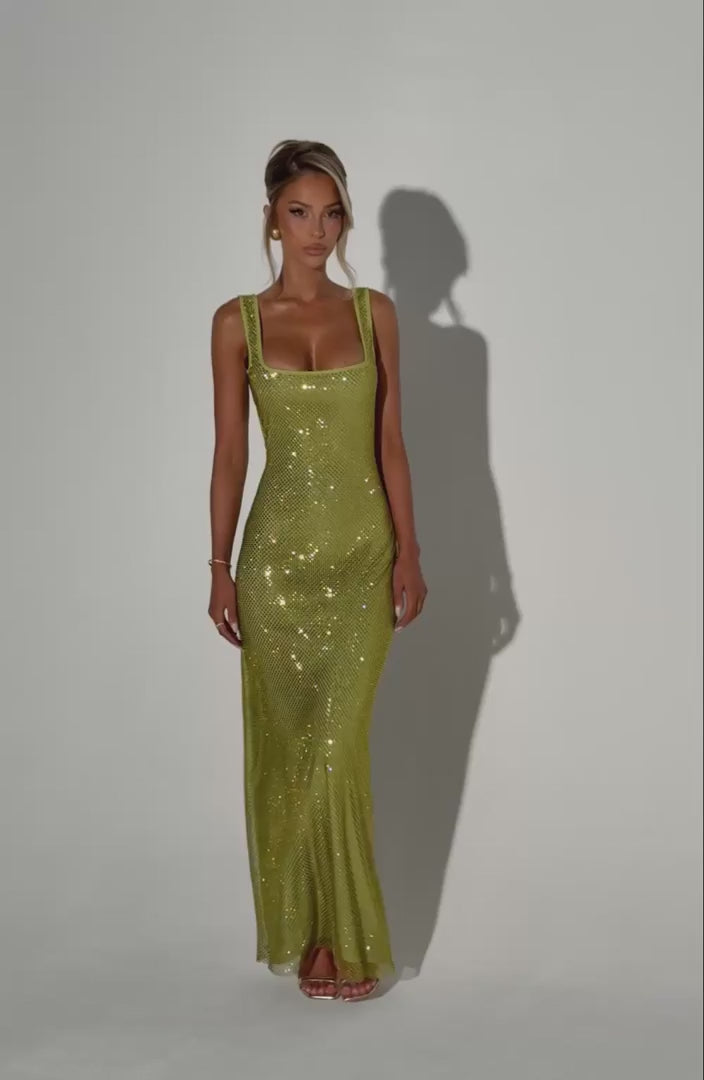 Be the star you are in the Petra dress, a shimmering, sparkling maxi cut from soft stretch net embellished with all-over rhinestones. With a sexy, semi sheer appearance, the dress is complete with a square neckline and low scoop back.