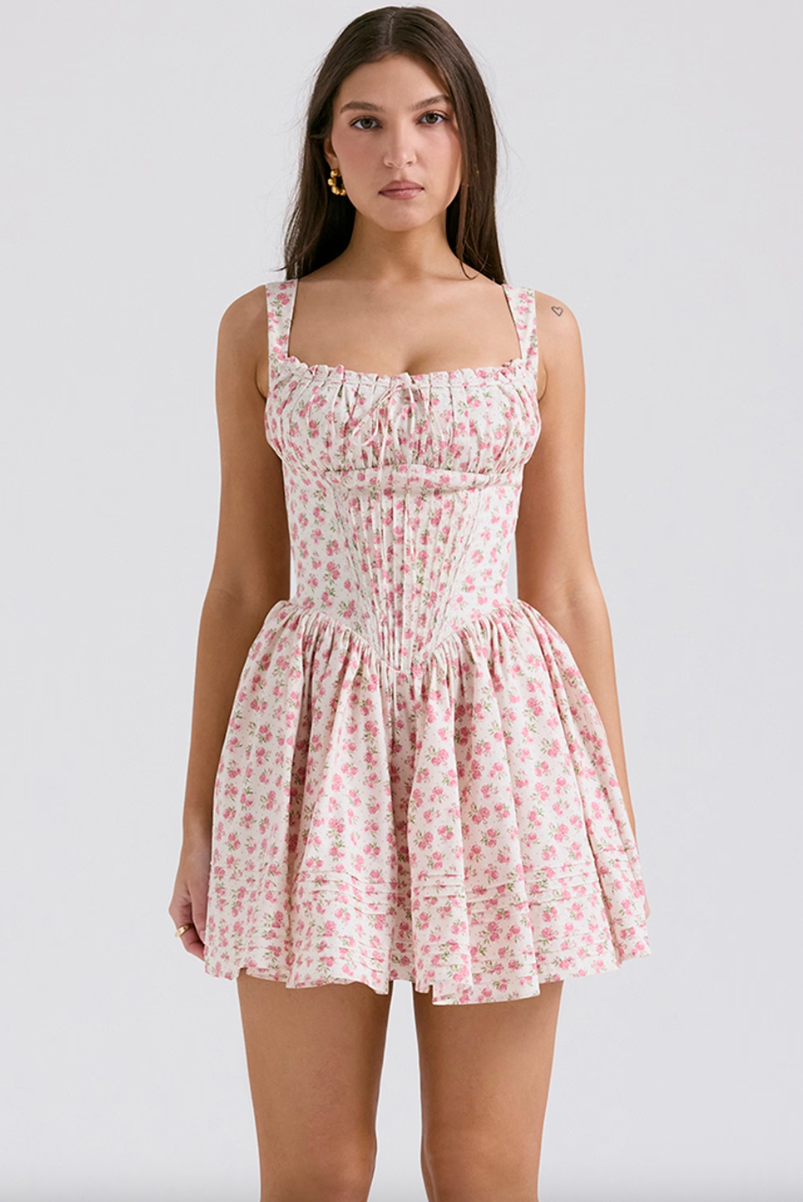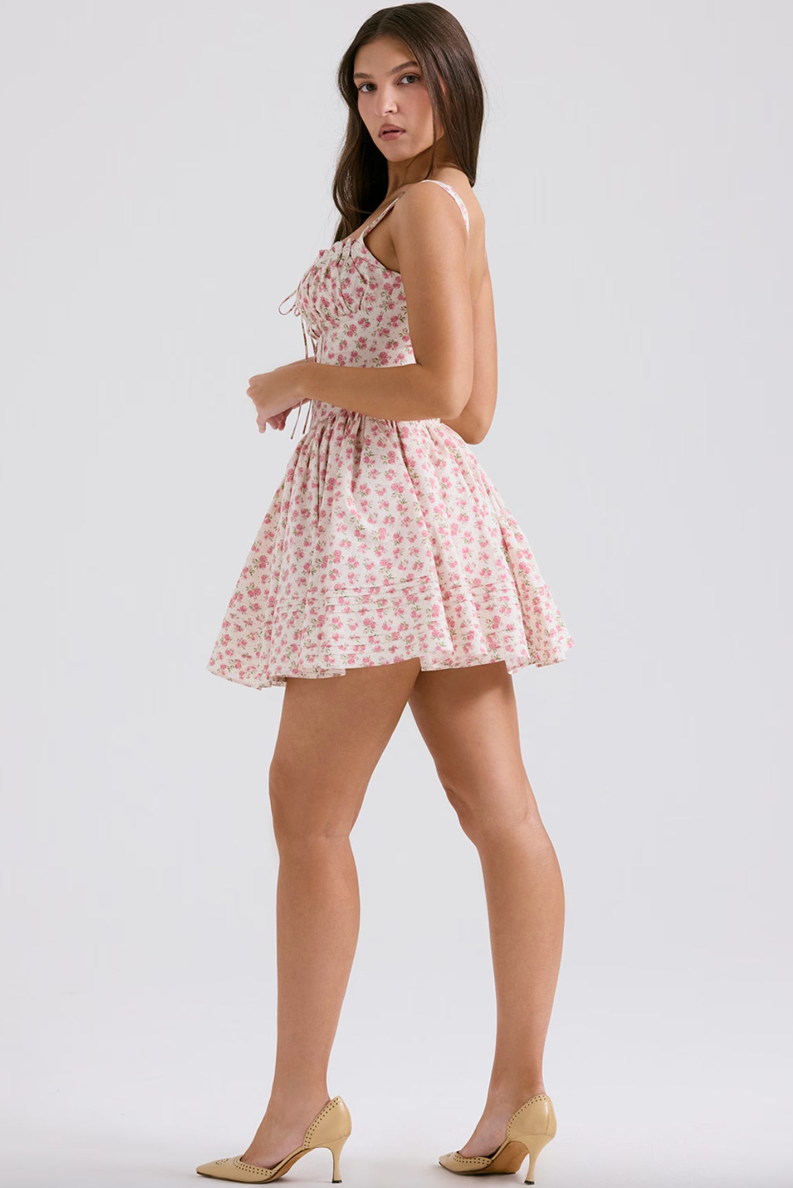 • Softly gathered bust with dainty ties