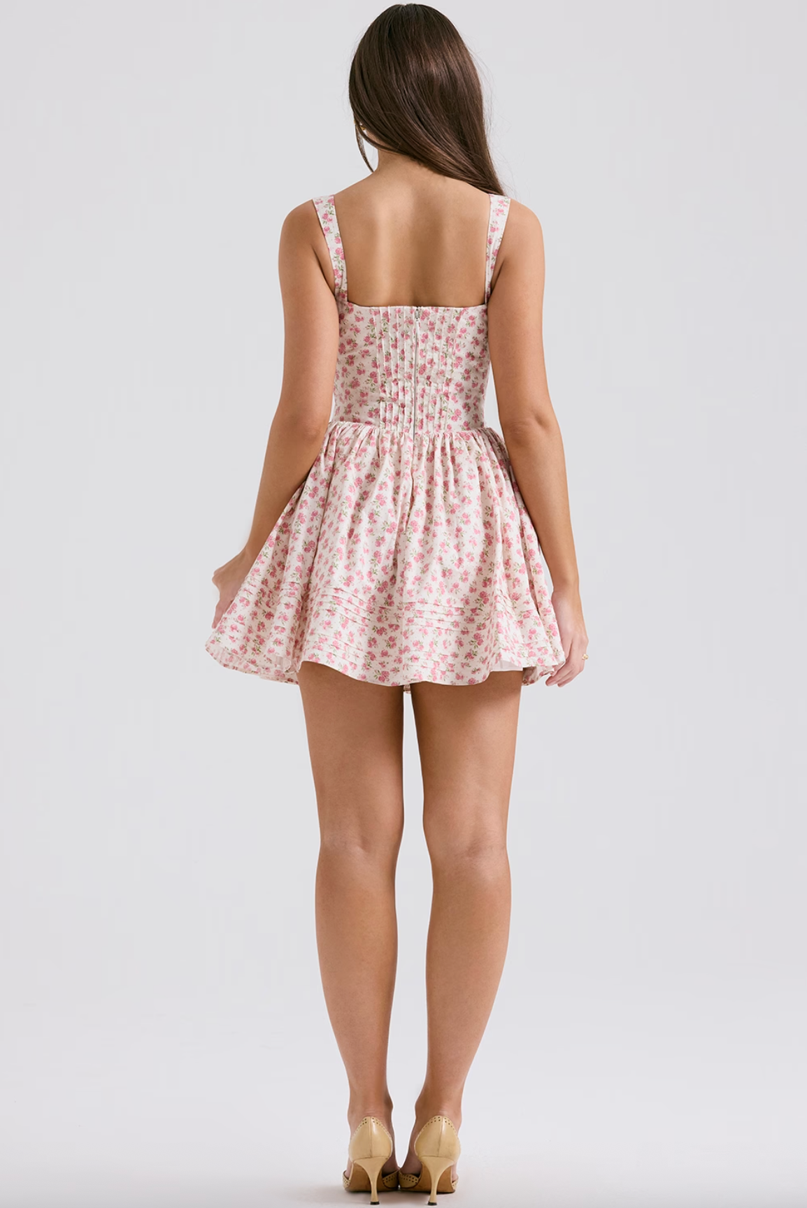 Introducing the Rhea Mini Dress, the ultimate expression of romance and timeless style. Crafted from stretch cotton-rich fabric, it features delicate pin-tuck details, a softly gathered bust with dainty ties, and a voluminous mini skirt that floats effortlessly. The back zipper ensures a seamless fit.