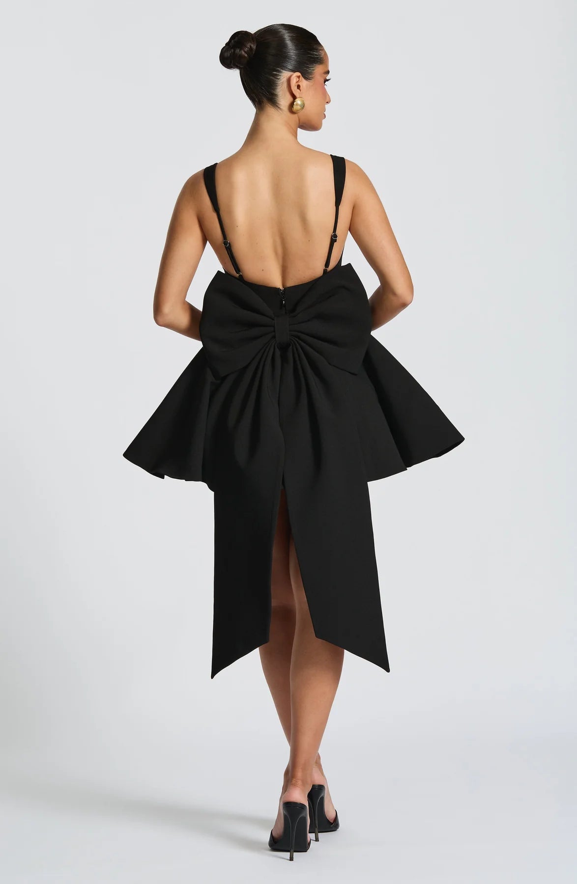 The Rue Mini Dress combines elegant structure with feminine grace. Its square neckline and boned bodice create a refined silhouette, complemented by a full circle skirt and low scooped back. Tapered straps and a detachable bow with long tails complete this sophisticated blush creation.