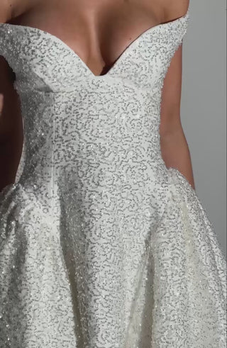 The Sapphire Mini Dress in white features a non-stretch crepe fabric with an elasticated back strap for a comfortable fit. Its plunge bardot neckline and full skirt with godet panels create an elegant, flattering silhouette perfect for refined occasions.